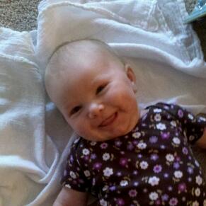 Hadley is about 2 1/2 months old and is consistently sleeping through the night. YIPPEEE! Now, I wish her almost 3yr. old sister would do that! Lilian whines and talks in her sleep more than anyone I've ever been around. Back to Hadley, she is almost 13 lbs, 24" long and is at the top of the growth charts. She is wearing several things 3-6 mo. sizes. I've already got a whole tub full of newborn clothes that I hope to never need again. RUMMAGE SALE! Just kidding, not yet. Hadley is a sweet little girl who's grin just melts my heart instantly!